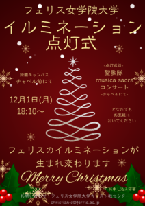 2025年12月1日(月)、緑園キャンパスにてキリスト教センター主催「イルミネーション点灯式」ならびに、聖歌隊 musica sacra による「クリスマスコンサート」が開催されます。
